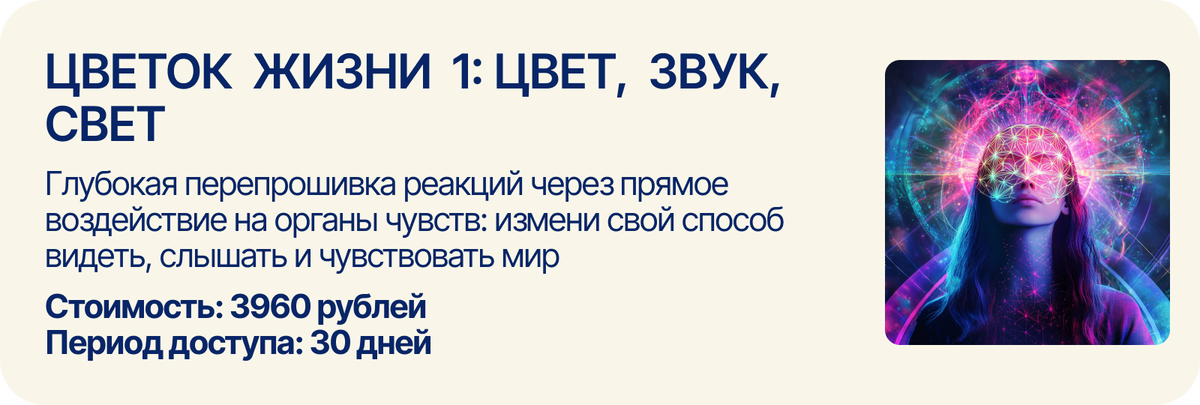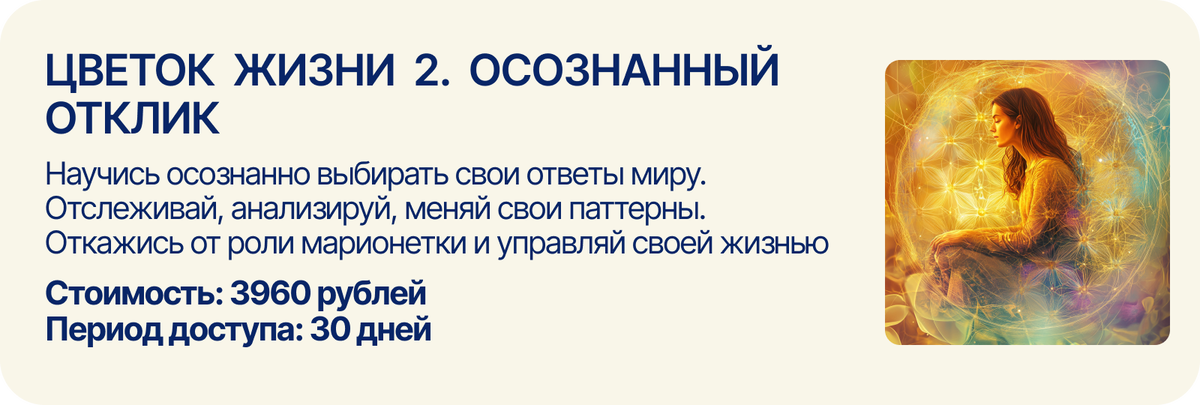 «Цветок жизни 2: Осознанный отклик» — это возможность изучить, как формируются Твои автоматические реакции и эмоциональные отклики в контакте с миром. Через практики осознанного наблюдения и психологический анализ Ты научишься распознавать скрытые механизмы, управляющие Твоим восприятием.